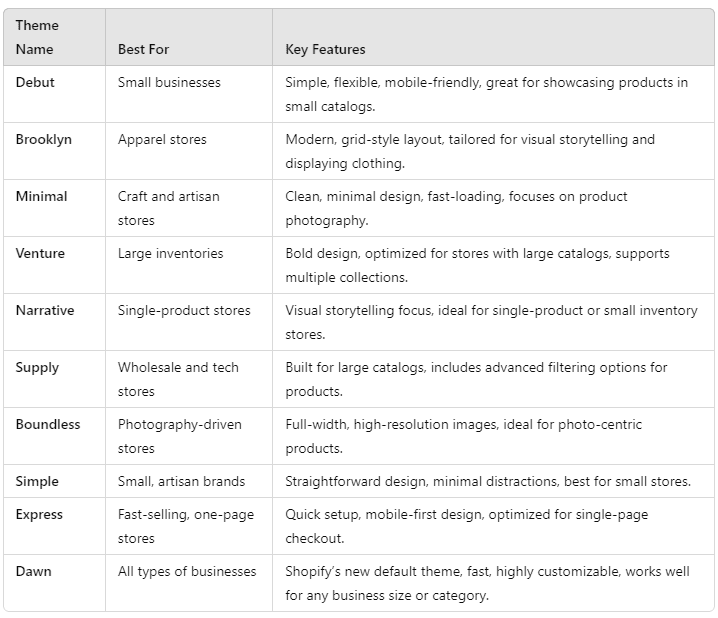 Themes like Venture and Supply are perfect for stores with large inventories, while smaller businesses can benefit from simpler themes like Debut or Simple.