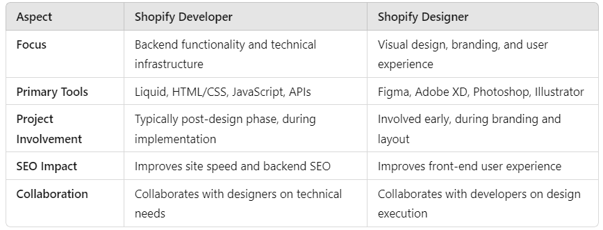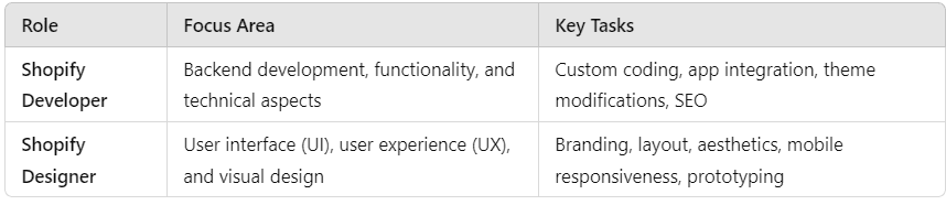 Understanding the differences between Shopify developers and designers is critical when deciding who to hire. Here’s a comparison of their key distinctions: