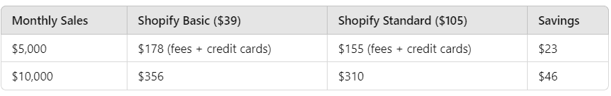Choosing the right Shopify plan can help you balance your needs and expenses. While it’s tempting to stick with Shopify Basic because of its lower monthly fee, stores with higher sales volumes will save money in the long run by upgrading to Standard or Advanced. This is because the higher-tier plans come with lower transaction fees and credit card processing rates, which can add up to significant savings as your sales increase.