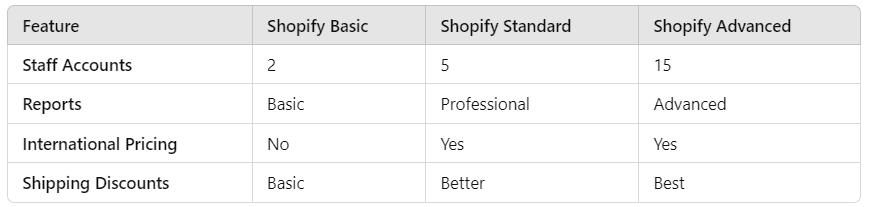 Each pricing tier offers different levels of access to features like staff accounts, reports, and shipping discounts. It's crucial to choose the right plan that matches your business needs to avoid overpaying for features you don’t need.