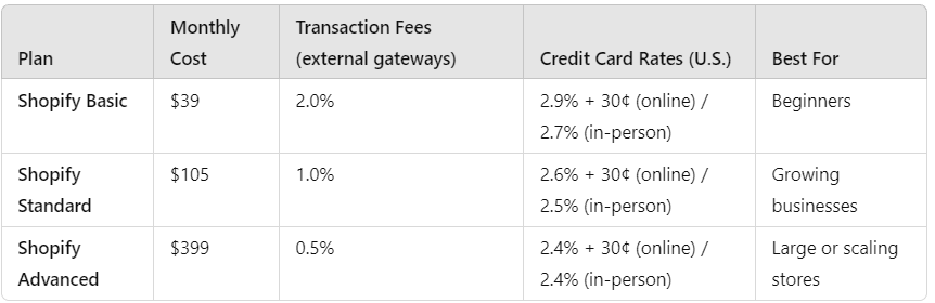 Credit Card Processing Fees: These fees apply whenever a customer uses a credit card to make a purchase. Shopify’s rates depend on your pricing plan, but for online transactions in the U.S., they range from 2.9% + 30¢ (Basic) to 2.4% + 30¢ (Advanced).
