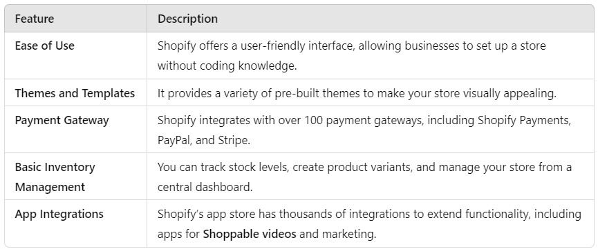 Integration with Shoppable videos: Shopify offers apps that allow businesses to implement Shoppable videos, enhancing user engagement.