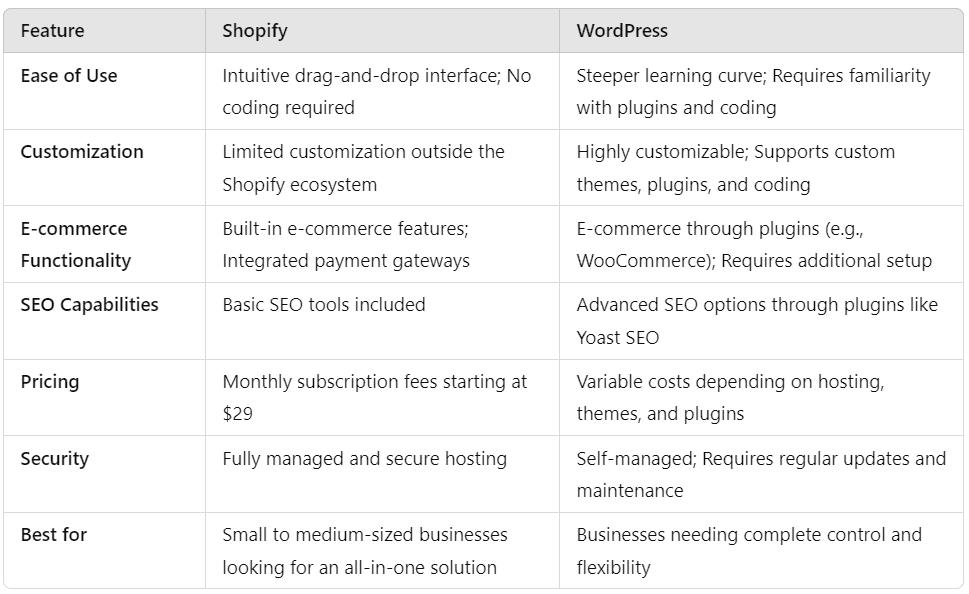 When choosing between Shopify and WordPress, it's essential to consider the key differences in terms of ease of use, customization, e-commerce functionality, and pricing. Below is a comparison table that highlights these aspects:
